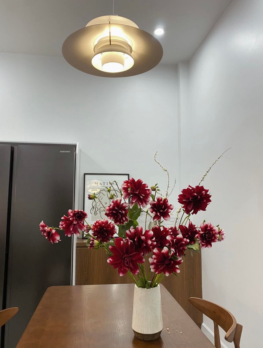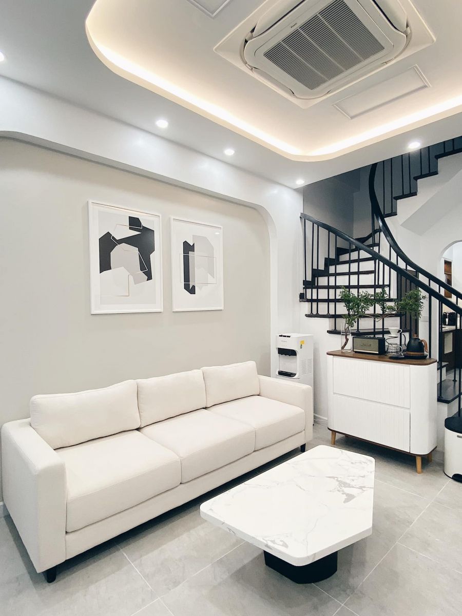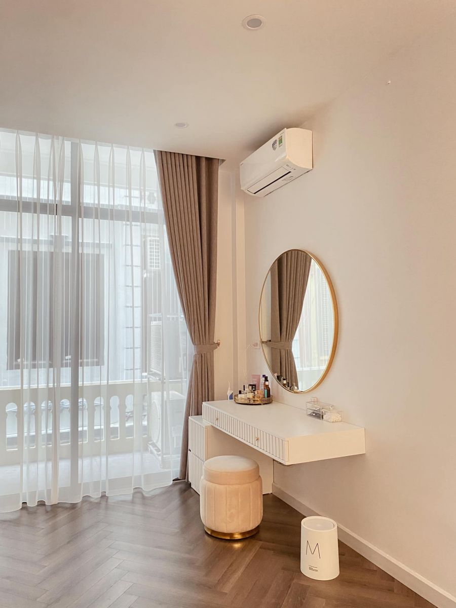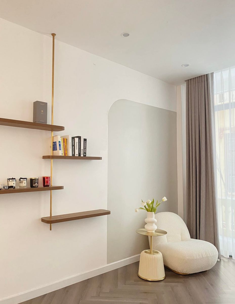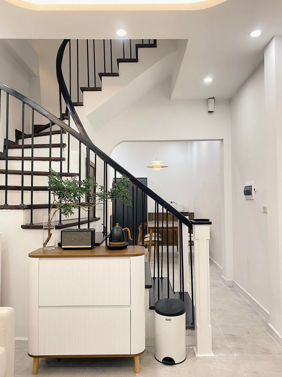 Tầng 1 chủ yếu được thiết kế theo phong cách Bắc Âu, đồ trắng và gỗ tự nhiên. Tầng 2 được thiết kế hiện đại hơn chút vì có nhiều chi tiết mạ PVD màu vàng kết hợp với sàn gỗ lát theo kiểu xương cá để làm không gian trông rộng và sang trọng hơn.